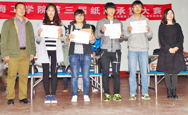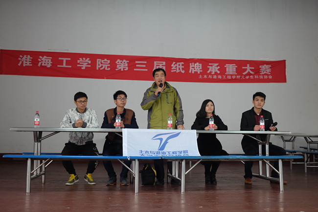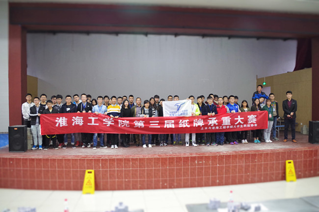 2016年11月6日下午两点半,由土木与港海工程学院大学生科技协会主办的淮海工学院第三届纸牌承重大赛,在淮海工学院通灌校区前程餐厅准时举行。本次纸牌承重大赛,全校共有200余支队伍、400余人参与,出席本次比赛的嘉宾有土木与港海工程学院党委书记吴建新、党委副书记李明金、辅导员卞辉,以及学生代表院大学生科技协会会长朱晨、校科协副会长朱圣等。