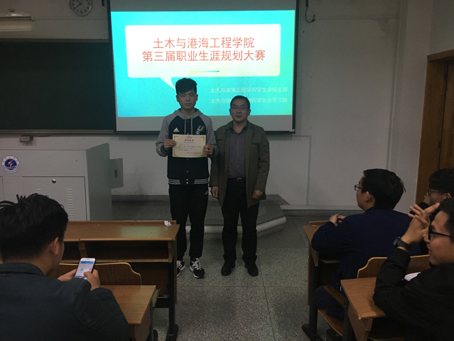为了更好地配合我校即将举办的第五届职业生涯规划大赛,在土木与港海工程学院范围内,选拔出更优秀的参赛作品,特举办本次大赛。自3月初启动后,大赛组委会收到2016、2015、2014级各班提交的众多职业生涯规划作品,经初选,确定六位选手进入决赛。决赛中,经选手一一展示,评委点评、打分。工管161孙彪获得一等奖,土木163王海峰等5人分获二等奖、三等奖。随后,郭利对各选手的表现一一点评,李明金、郭利分别为获奖选手颁奖。